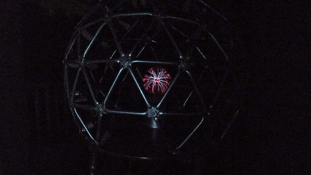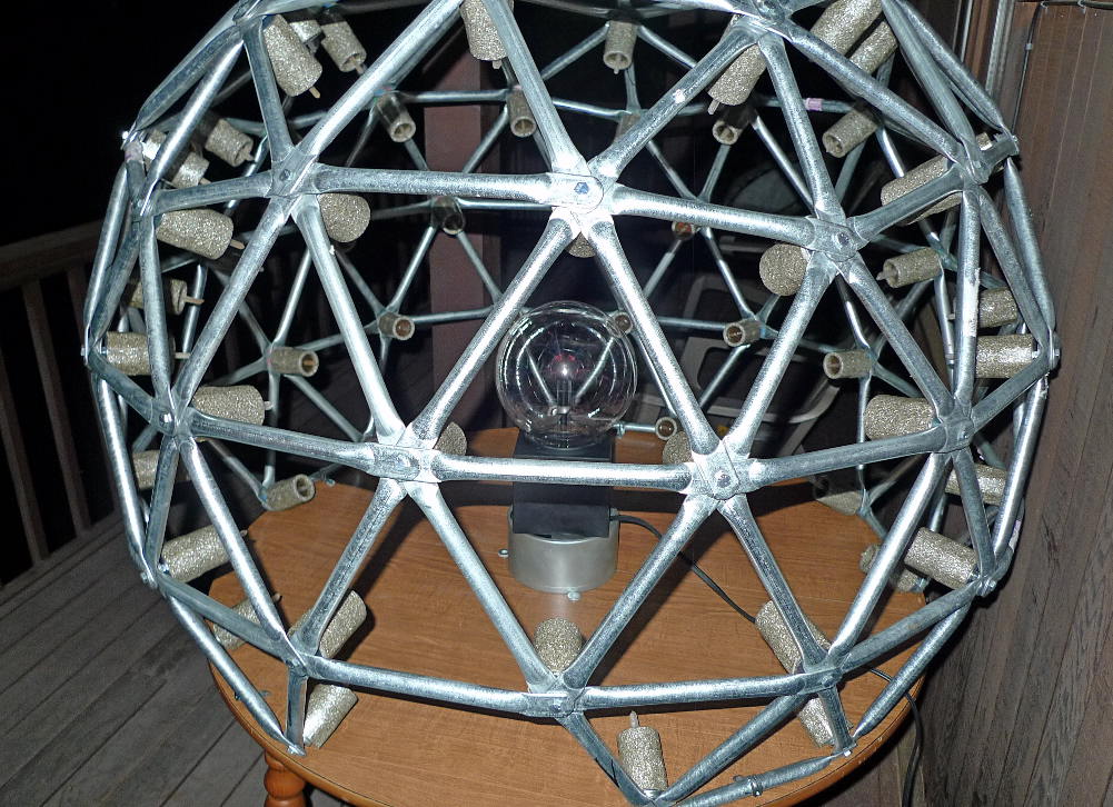 I made this for myself and not to sell, but the unusual orgonia pieces developed for this device will be for sale individually on the Orgonia site soon. The outside of these is made of aluminum shavings orgonia while the inner core in which the long, thin crystals are embedded is made of copper shaving orgonia with the usual additives – petalite powder, rose quartz chips, amazonite chips, selenite flakes, and betrandite powder. The butt of the each orgonia piece was tapped and threaded  so as to screw onto the projecting ends of the bolts that fasten each geodesic joint. In alignment with the plane of the bolts each of them beams energy towards a common focal point at the center of the partial sphere. Anything placed at that focal point is bombarded by orgone and flares up hugely with magnification. Most often a very fine rutilated quartz ball sits at the focal point, but at night or in “party mode” an old Radio Shack plasma ball is placed there. Plasma balls are actually sources of electropollution as radio waves, so the orgonia is stimulated to shoot out even more sweetly transformed energy. There are things going on with this device that I haven’t figured out yet – let’s just say it is an adventure.
